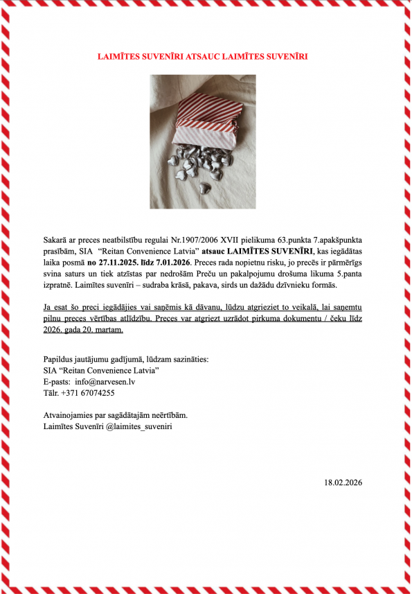 Sakarā ar preces neatbilstību regulai Nr.1907/2006 XVII pielikuma 63.punkta 7.apakšpunkta prasībām, SIA “Reitan Convenience Latvia” atsauc “Laimītes Suvenīri”, kas iegādātas laika posmā no 2025. gada 27. novembra līdz 2026. gada 7. janvārim.